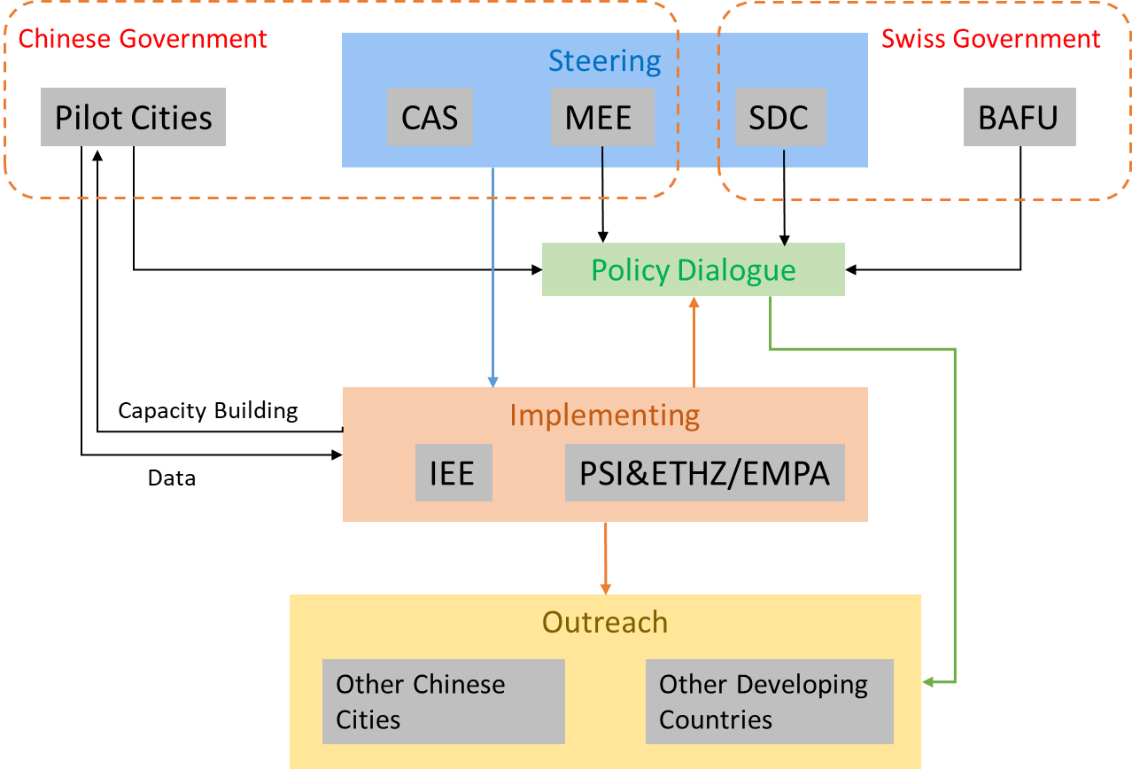 The key implementing partners of the Project will be three scientific institutes, IEE, PSI and the Institute of Environmental Engineering of ETHZ, which already had cooperation befor. The Project will support them to deepen the cooperation in long-term and create policy influence. BAFU will be an important partner in this project to support the policy influencing process. Hence, a range of other relevant and competent Swiss and Chinese institutions will be linked to this project. Contributions of partners and specific roles are presented in the following.